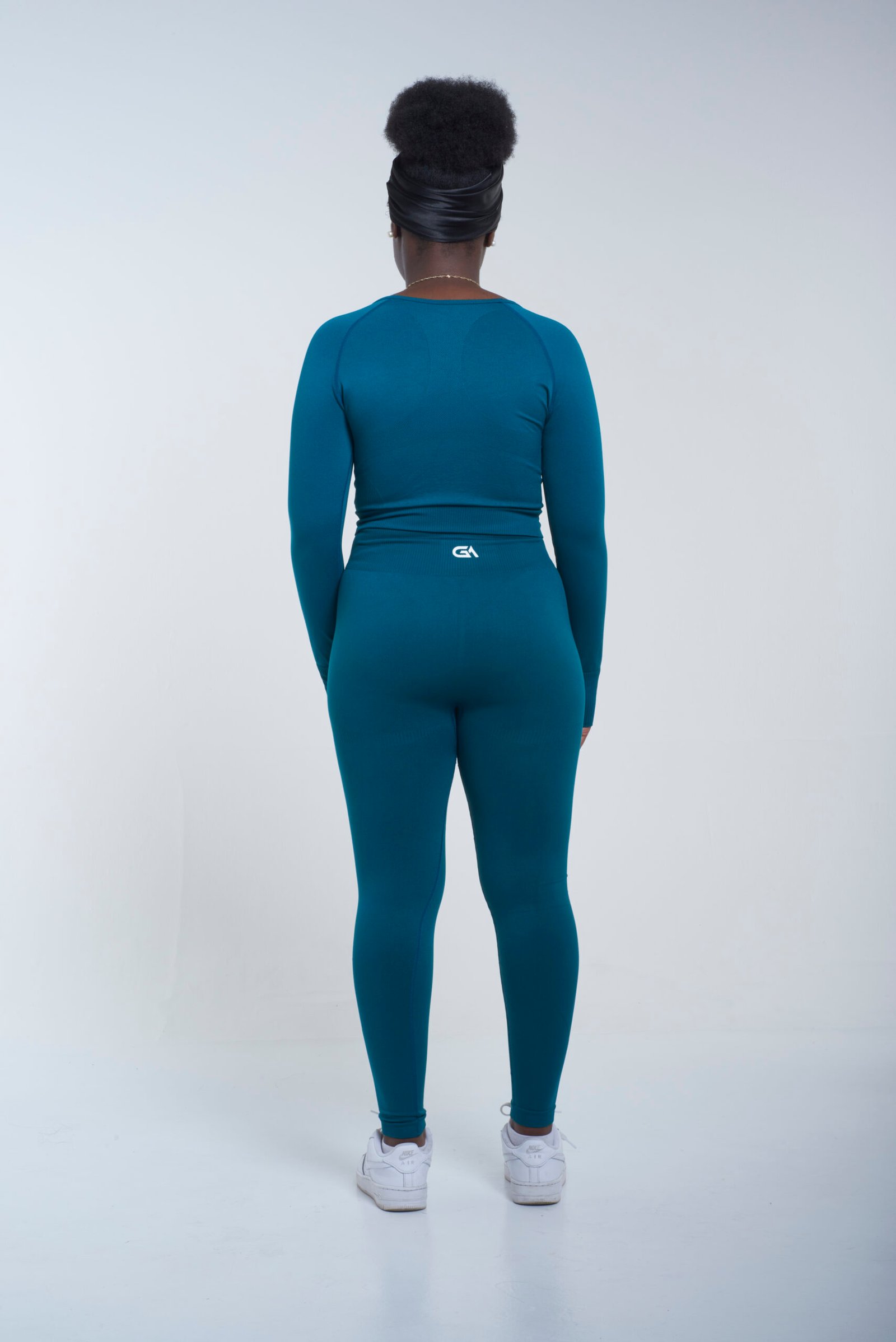 Seamless long-sleeve top and high-waist leggings with four-way stretch and moisture-wicking comfort. Sculpting fit that stays put and a clean GA logo finish.